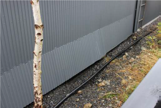 Figur 3: Vegg av bølgeblikk ble presset ut som følge av vannbølgen fra karet som revnet Foto: © Fiskeridirektoratet.