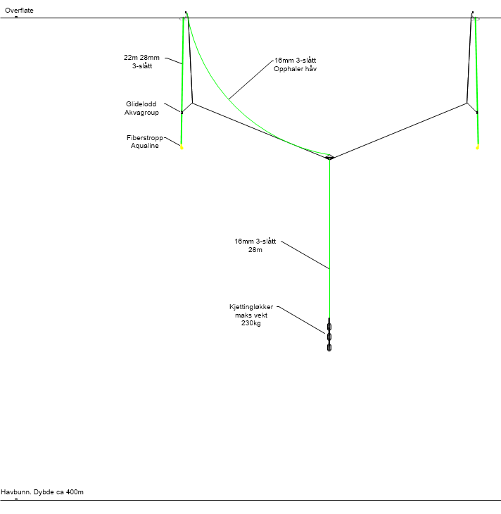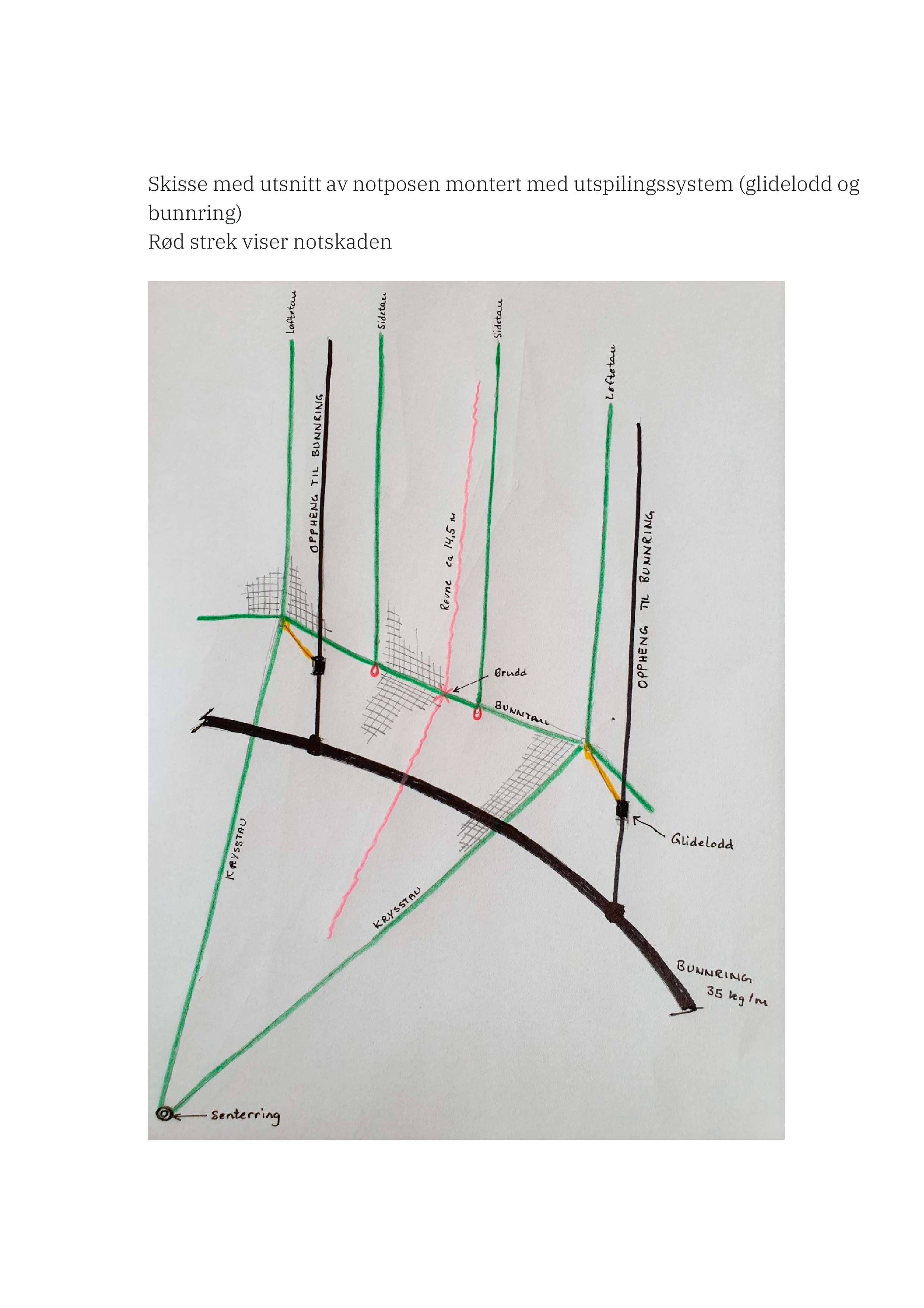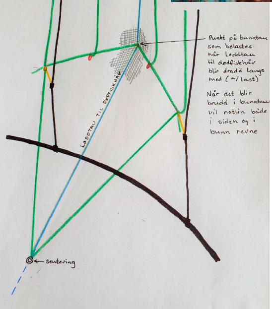 Den aktuelle merden bestod av en not med en bunnring som var opphengt i flytekragen med spectratau. Det var glidelodd, hver på 60 kg, festet til noten langs bunntau (Fig.2). I noten var det montert en tradisjonell dødfiskhåv. For å operere denne type dødfiskhåv, må notposen være utstyrt med et håvtau. I denne noten ble det brukt et gjennomgående håvtau, som betyr at håvtauet gikk på innsiden av notposen, ut gjennom senter av notposens bunn og ned i sjøen, med et lodd montert i enden som veide 220 kg. (Fig.2)