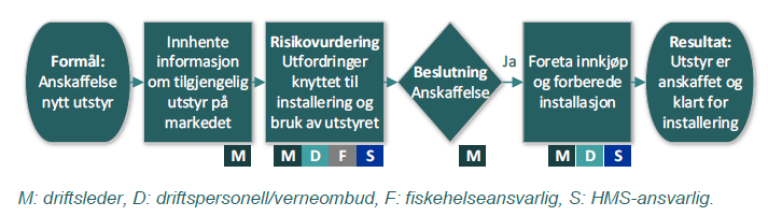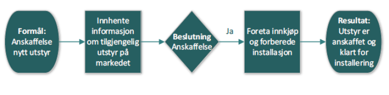 Prosessen som er vist under er en delprosess for anskaffelse av utstyr, med aktiviteter, roller og verktøy: