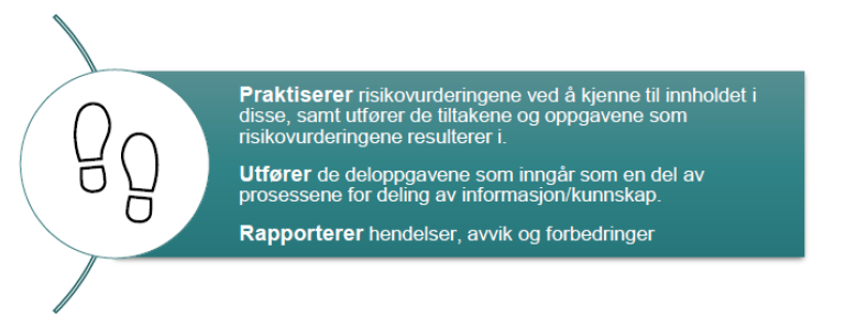 Helhetlig risikostyring er ikke noe bare HMS-ansvarlig skal drive med. Sikkerhet er aldri noe som «noen andre» jobber med. Risikostyring angår alle i en virksomhet, og for å lykkes med helhetlig risikostyring må dette være integrert på alle nivåer og i alle aktiviteter. Dette innebærer også at helhetlig risikostyring ikke er begrenset til at røkterne og andre operatører etterlever sikkerhetsprosedyrene.
