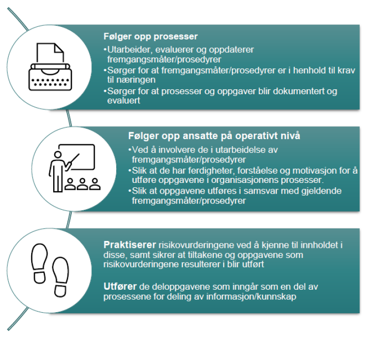 Mellomledere har ansvar for å styre og støtte daglig drift, og må følge opp virksomhetens prosesser og ansatte ved å utarbeide prosedyrer/rutiner og sikre at tiltak fra risikovurderinger blir utført. De må være «tett på» driftspersonell for å sikre god operasjonsplanlegging og fange opp farer som kan true virksomheten. Mellomledere må også ha en aktiv rolle i å dokumentere ulike risikovurderinger som blir gjort i praksis.