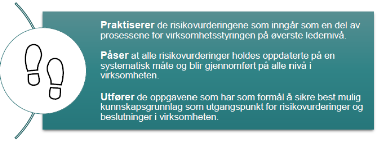 Under følger prinsippene for risikostyring i korte trekk. Prinsippene er videre eksemplifisert i kapittel 4.