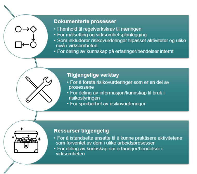Håndtering av risiko skjer gjennom planlegging og gjennomføring av tiltak som en del av virksomhetens prosesser. Tiltakene kan utgjøre verktøy for å identifisere og håndtere risiko, slik som risikovurderinger på virksomhetsnivå, rapporteringssystemer, risikoanalyser som del av operasjonsplaner, prosedyrer som hensyntar eksponering for farer, operasjonsmøter med risiko som en del av agendaen, eller beredskapsplaner.