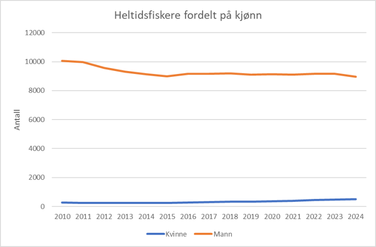Figuren under viser antall heltidsfiskere fordelt på kjønn i perioden 2010-2024.