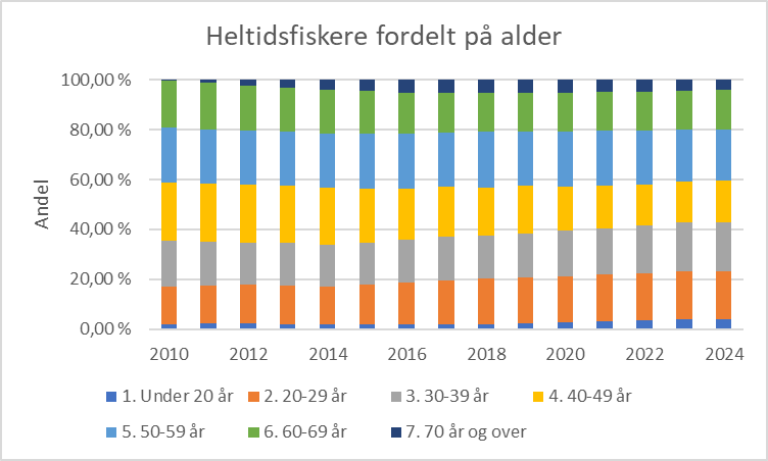 Totalt sett har andel yngre heltidsfiskere vært stigende. Fordelingen mellom aldersgruppene er imidlertid relativt stabil fra 2023 til 2024.