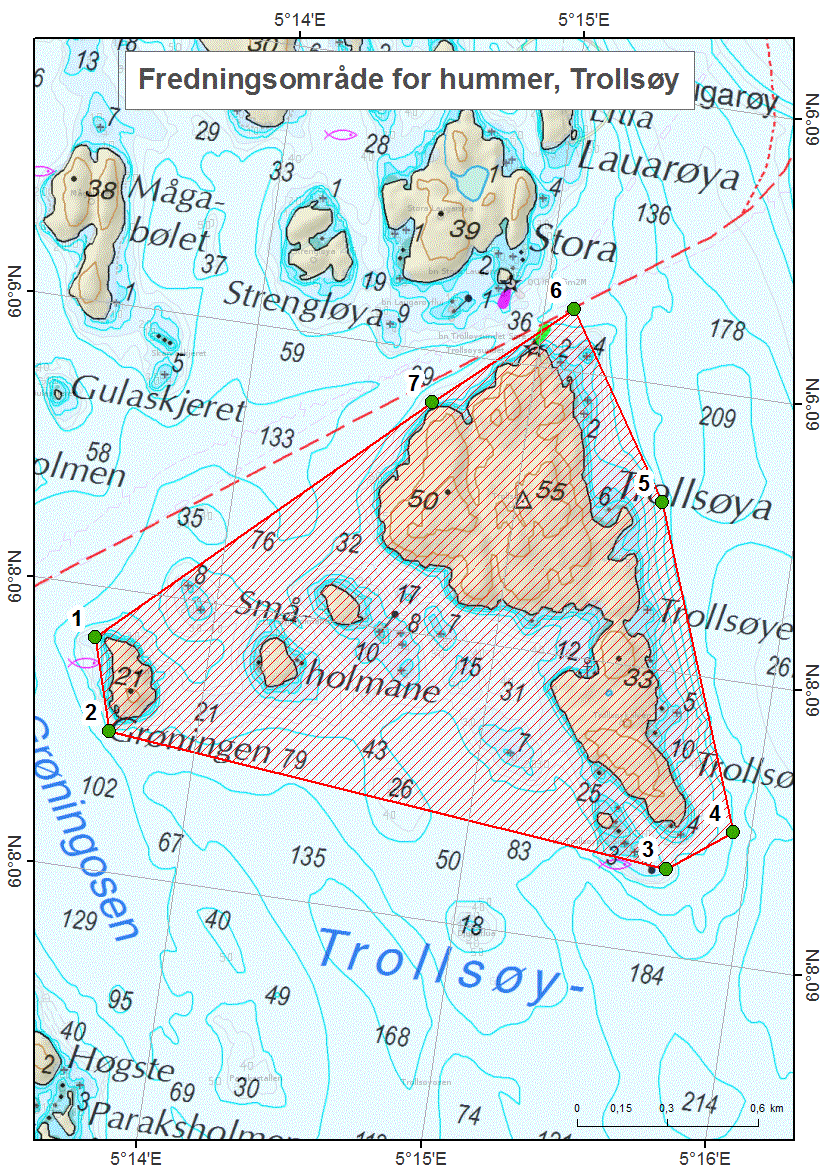Det er forbudt å fiske med hummerteiner langs hele sjølinjen ned til 50 meters dyp regnet fra laveste vannstand i områdene avgrenset av følgende posisjoner angitt i grader og desimalminutter (jf. kartvedlegg):