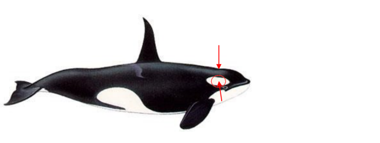 Hos spekkhogger ligger hjernen omtrent rett innenfor den hvite flekken over øyet. Fra siden bør skuddet rettes i midten av kvitflekken og ovenfra i midtlinjen slik at den passerer dette området, se figur 6. Det anbefales å bruke tilsvarende ammunisjon som til vågehval, det vil si gevær med minimum kaliber på 9,3 mm og helmantlet, rundneset kule.