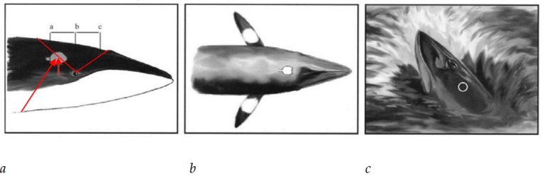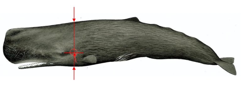 På grunn av «spermbollen» i hodet bør spermhval helst skytes fra siden. Da skal skuddet rettes mot det punktet på skallen hvor den vertikale linjen krysser av en tenkt horisontal linje fra øyet, se figur 5.